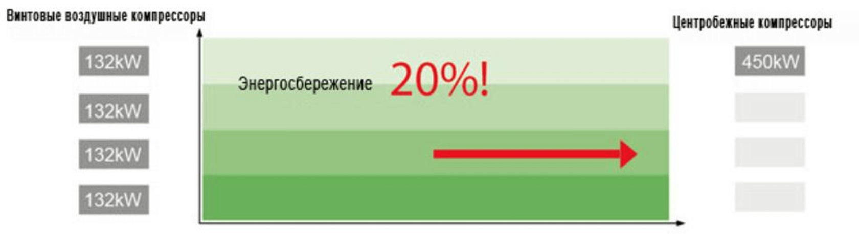 Чем выше производительность, тем выше эффективность. Один центробежный компрессор заменит сразу несколько винтовых компрессоров, что сэкономить более 20% энергопотребления. Заменив несколько винтовых компрессоров на один центробежный вы помимо электроэнергии сэкономьте расходы на техническое обслуживание, время технического обслуживания и место на установочной площадке