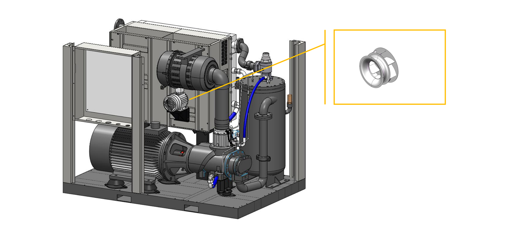 Мы используем центробежные вытяжные вентиляторы, мин. уровень шума, вытягивают горячий воздух из внутренней полости компрессора для поддержания комфортной температуры работы компрессора.